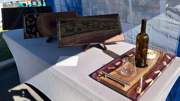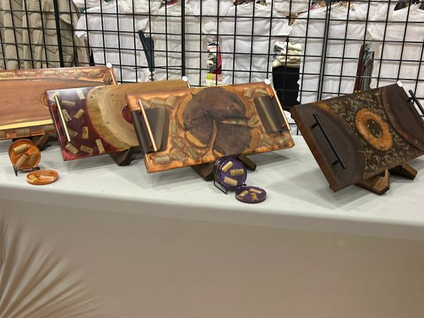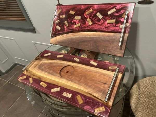 Discover unique charcuterie boards crafted from distinctive wood and epoxy, featuring embedded objects. Custom boards also.
