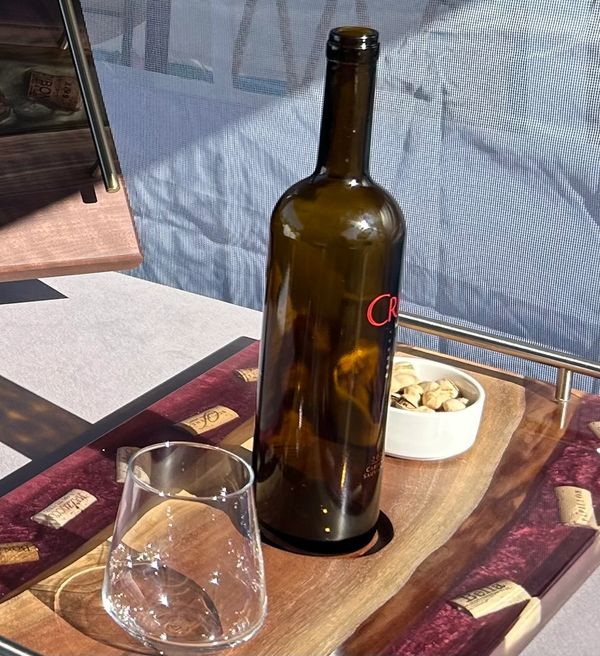 Wooden serving tray with embedded wine corks in resin and brass handles