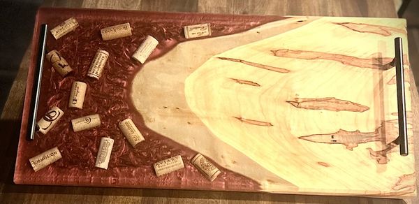 Wood and resin serving tray with embedded wine corks and metal handles.