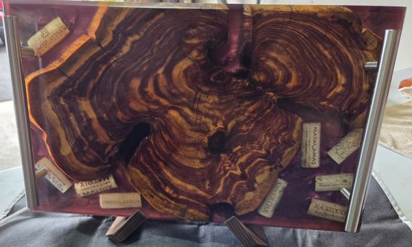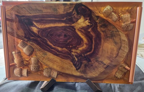 Wood and resin serving tray with embedded wine corks and metal handles.
